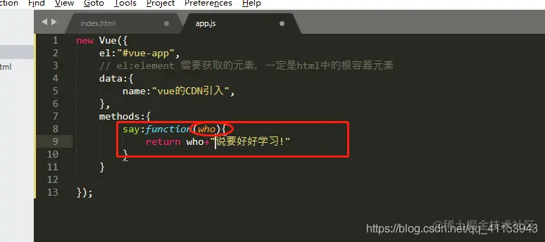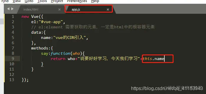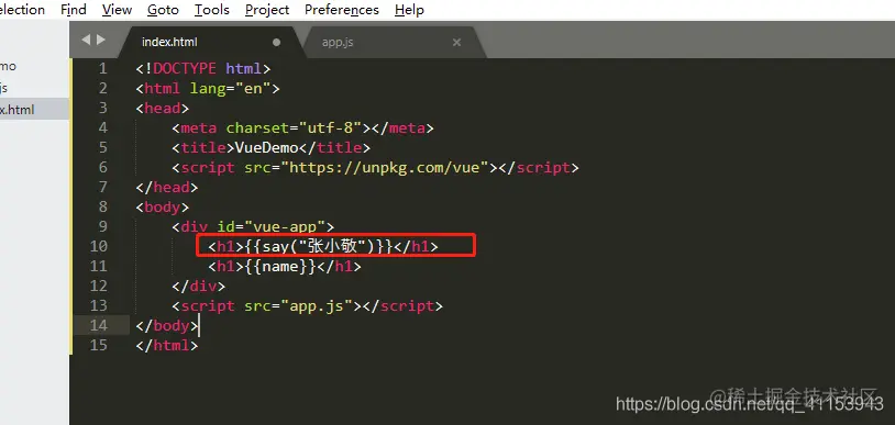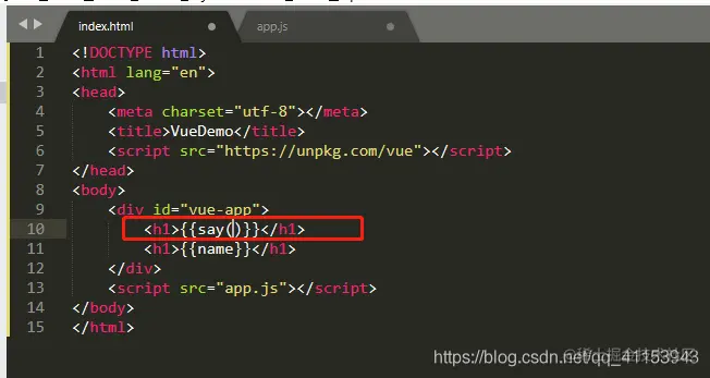 同样在html的根容器的标签下,引入say方法,同data中name的调用,因为say是个方法,方法后面应该加(),所以代码如下: