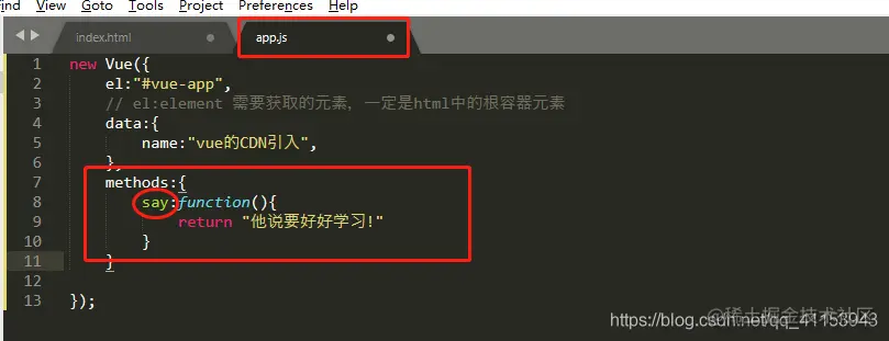 在Vue中方法(methods)和data属于同一量级的属性,所以在Vue中有methods模块,对于方法的定义都定义在这个区域内。如下,在methos内定义一个say的方法,返回"他说要好好学习"内容。