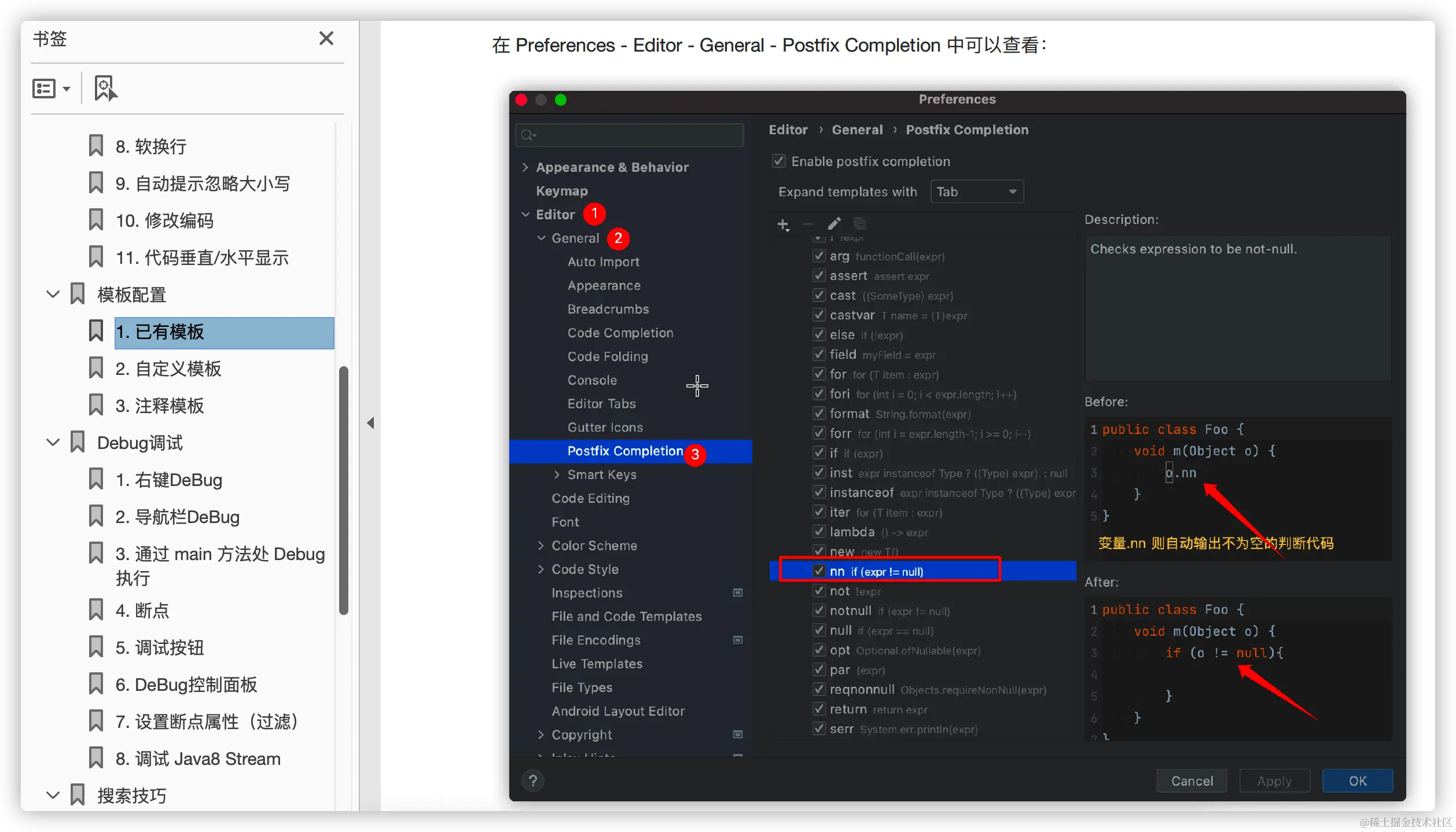 还有能够极大提高编码效率的代码模板学习和自定义配置,比如只要输入 变量.nn 就可以自动帮我们添加非空判断的代码: