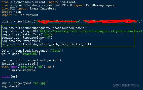 请求返回结果数据,ImageURL是美妆后的图片地址。