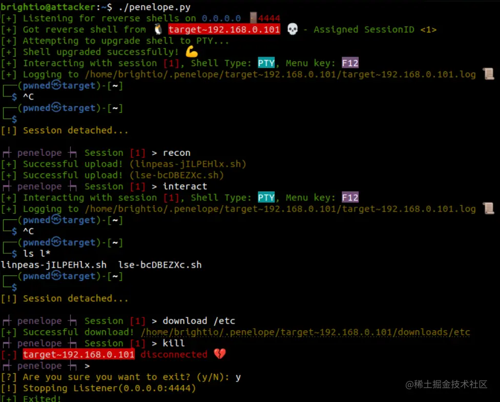 Penelope是一款功能强大的Shell处理工具,该工具的主要功能是在利用RCE漏洞的过程中,替代netcat并作为Shell捕捉器来使用。该工具可以在Linux和macOS上工作,只需要安装并配置好Python 3环境即可。该工具没有任何的第三方依赖,使用起来非常简单,跨平台性也很好。