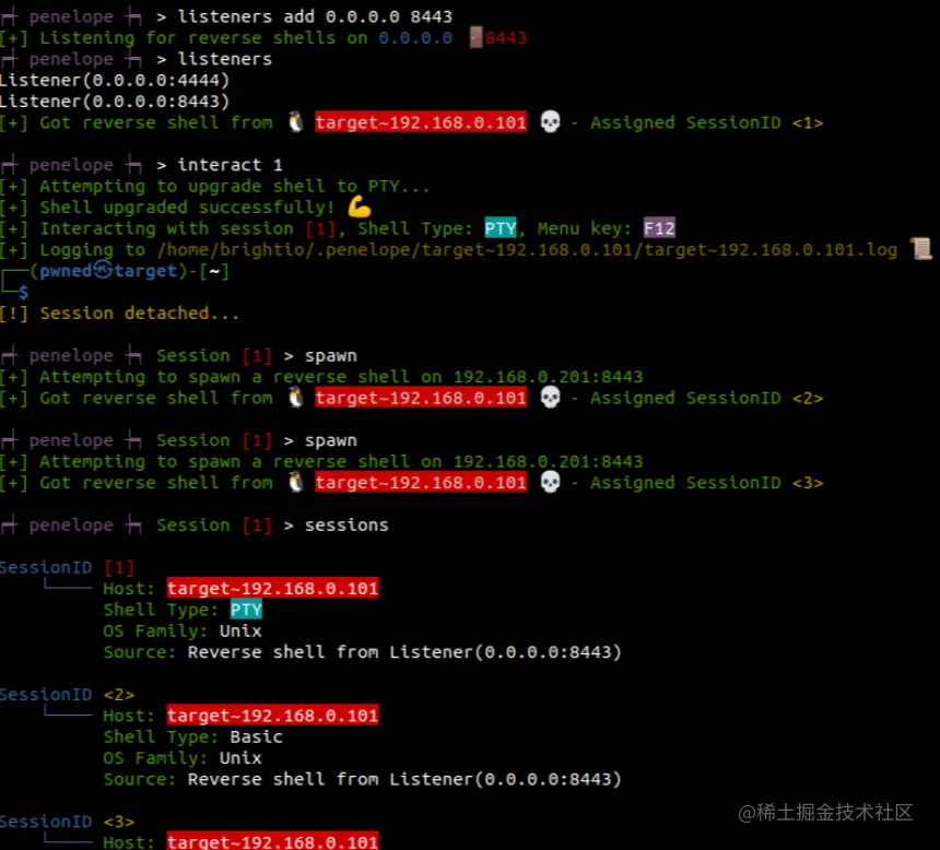 Penelope通过设置“set DisablePayloadHandler True”来禁用Metasploit的默认Shell处理器,并与Metasploit结合使用。