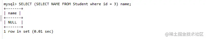 那为什么这个会输出NULL呢,原因在于此时SELECT (SELECT NAME FROM Student where id = 3) 被当作表达式解析求值,对于表达式求值来说, 要么有值,要么为NULL。 上面的那种写法被称为标量子查询,