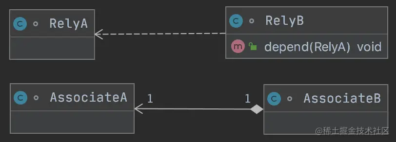 依赖关系:常用来描述方法局部变量或者入参,即类的方法中调用了另一个类。关联关系:类的成员变量是另一个类,比如常见的一对一,一对多关系。