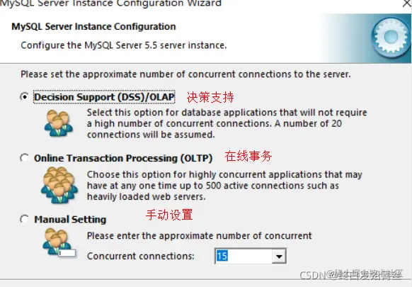 决策支持系统:对于不需要大量并发连接的数据库应用程序,请选择此选项。 承载 20 个连接左右 在线事务处理:对于可能同时最多具有 500 个连接的高度并发的应用程序(例如负载较重的 Web 服务器),请选择此选项 手动设置:请输入并发连接的大概数量