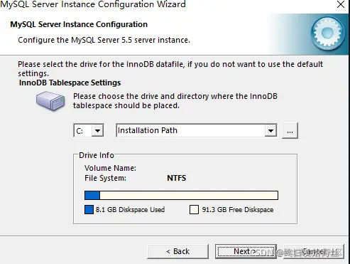 如果您不想使用默认设置,请选择 InnoDB 数据文件的驱动器,不过建议是默认