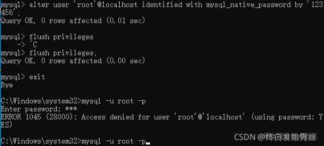 修改密码:ALTER USER 'root'@'localhost' IDENTIFIED WITH mysql_native_password BY '新密码';