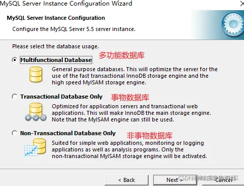 多功能数据库:通用的数据库,这将优化服务器,使用 InnoDB 快速事务存储引擎和 MyISAM 高速存储引擎 专注事务数据库:针对应用程序服务器和事务性 Web 应用程序进行了优化。 使用 InnoDB存储引擎。 请注意,MyISAM 引擎仍然可以使用 非事务处理型:适用于简单的 Web 应用程序,监视或记录应用程序以及分析程序。 只有 MyISAM 事务性存储引擎被激活 推荐选择专注事务数据库(Transactional Database Only)