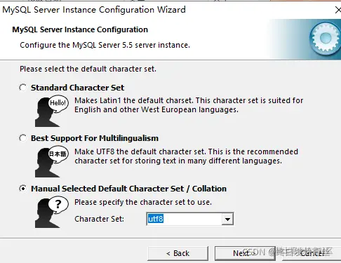 标准字符集:将 Latino 设置为默认字符集,此字符集适用于英语和其他西欧语言 最多语言支持:将 UTF8 设置为默认字符集。 建议使用此字符集来存储许多不同语言的文本 手动选择的默认字符集和排序规则:请指定要使用的字符集。这里我们使用 UTF8 编码