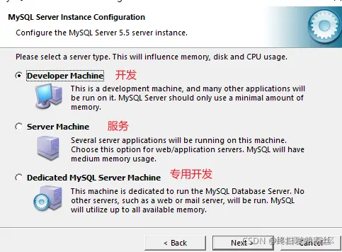开发测试类型:此电脑是一台开发测试的机器,许多其他应用程序将在其上运行。MySQL 服务器仅使用最少的内存 服务器类型:此电脑上将运行几个服务器应用程序。选择此选项作为 Web 或者应用程序的服务器。MySQL 将使用中等的内存空间 专用的 MySQL 服务器类型:此电脑专用于运行 MySQL 数据库服务器。此电脑不会运行其他服务器,例如 Web 或邮件服务器。MySQL 将利用所有可用内存 一般选择服务器类型(Server Machine),看个人情况