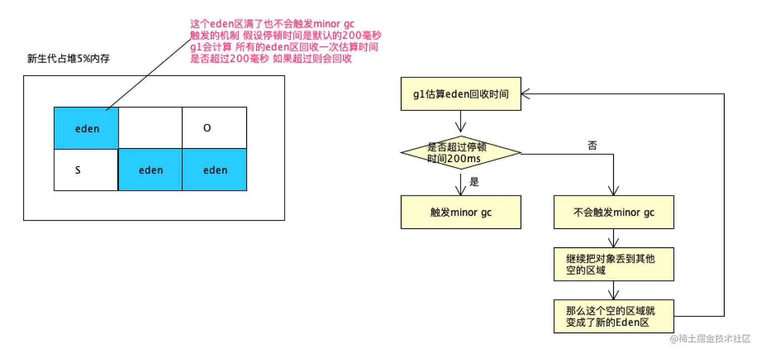 在触发minor gc之前会计算下当前的eden区回收时间是否会超过最大停顿时间