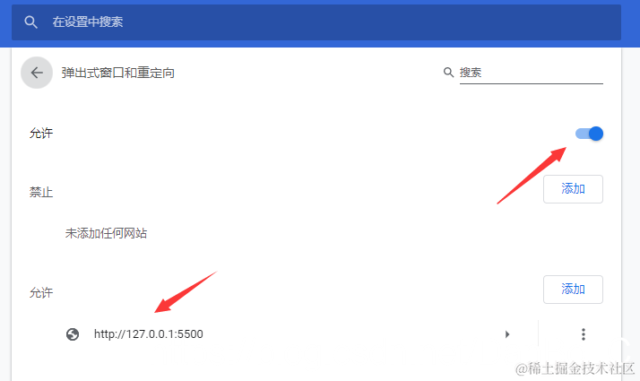 设置 -> 网站设置 -> 弹出式窗口和重定向中打开允许,或者在允许中添加测试页面的地址。