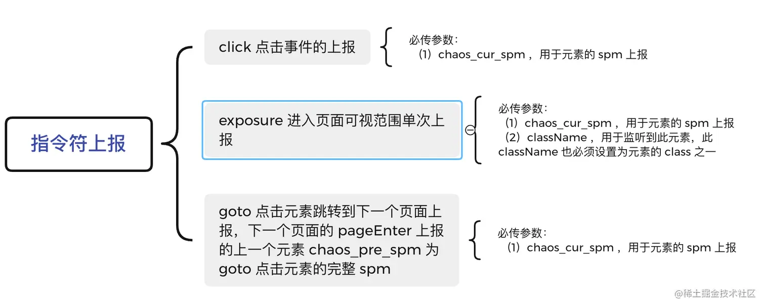 - exposure 曝光事件的上报。使用方法:v-report.exposure。不仅会进行单点曝光,即元素一出现就进行一次曝光上报,还会在元素隐藏后进行一次曝光时长的上报。
