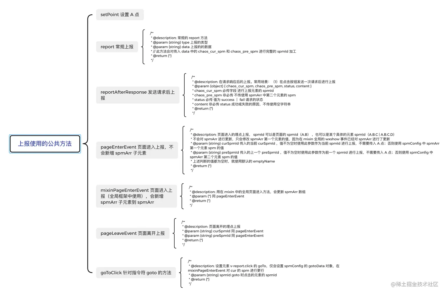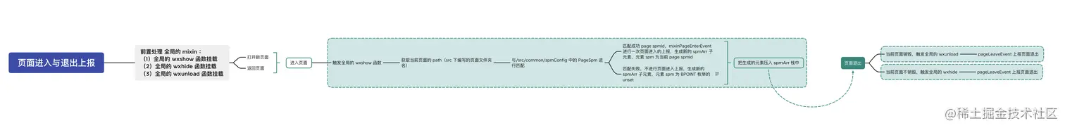 (1)pageEnterEvent 和 mixinPageEnterEvent 的区分: mixinPageEnterEvent 会在页面栈中新增一个页面元素;pageEnterEvent 会把页面栈的第一个元素的 spm 改为传入的值。原因是有些页面可能是同一个组件复用的(如:登录和注册页面会复用同一个组件,只在样式上进行区分),页面的 spm 需要进入后进行一定的逻辑判断才能确定,提供 pageEnterEvent 就可以在确定 spm 后手动进行一次上报,而不会破坏全局维护的页面栈中元素的顺序。