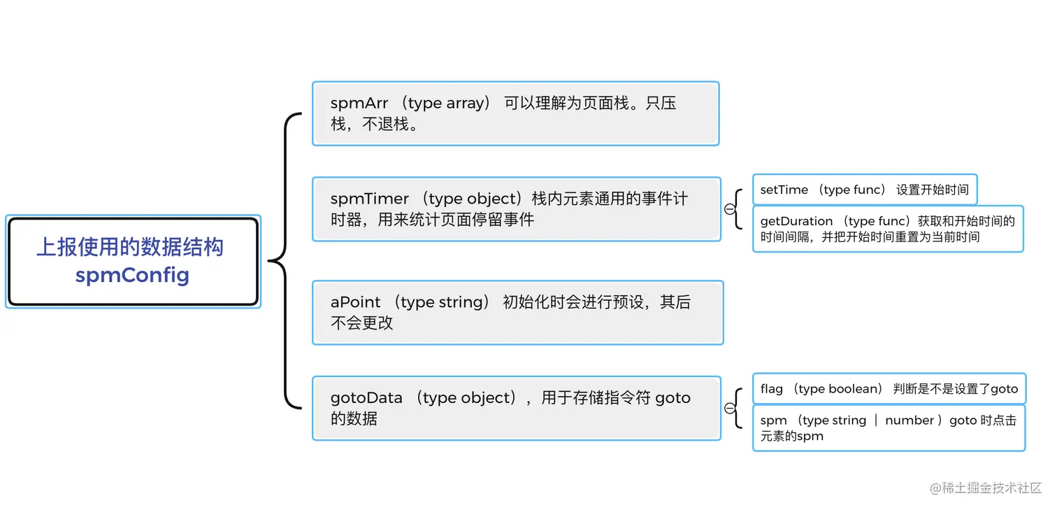 - spmTimer 是页面停留时间的计时器。页面进入重置时间为当前时间,页面离开统计时长并上报。