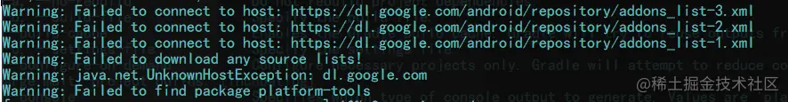 Warning: Failed to connect to host: https://dl.google.com/android/repository/addons_list-1.xml