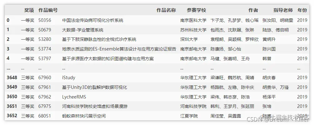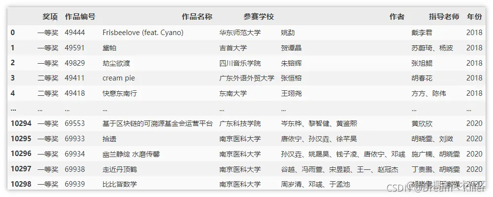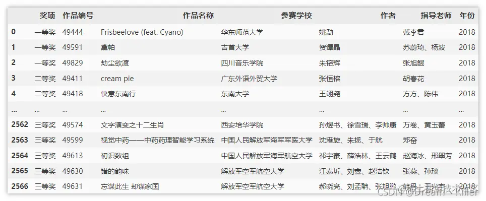 result_df.columns = ['奖项', '作品编号', '作品名称', '参赛学校', '作者', '指导老师']