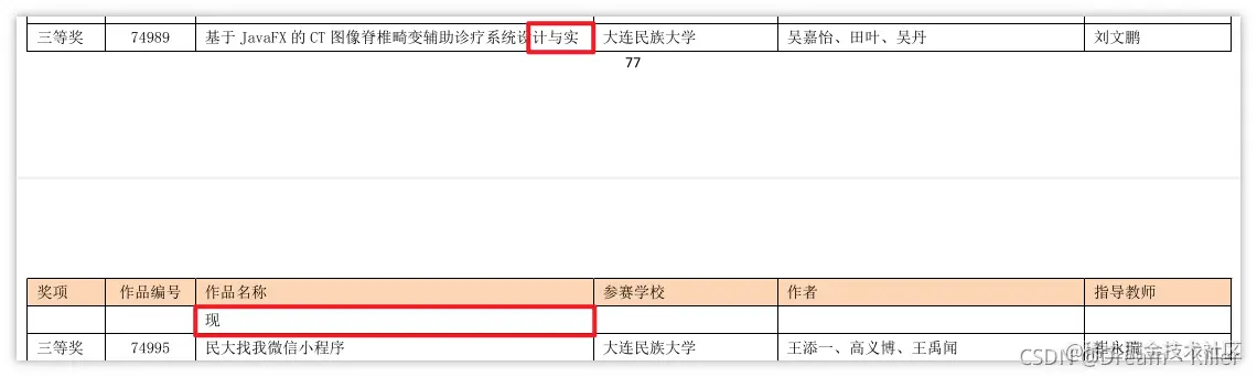 # 部分信息过长导致在分页处被分割,分别出现在两页上,下面将奖项为空的数据添加到上一条数据的信息中。