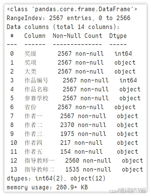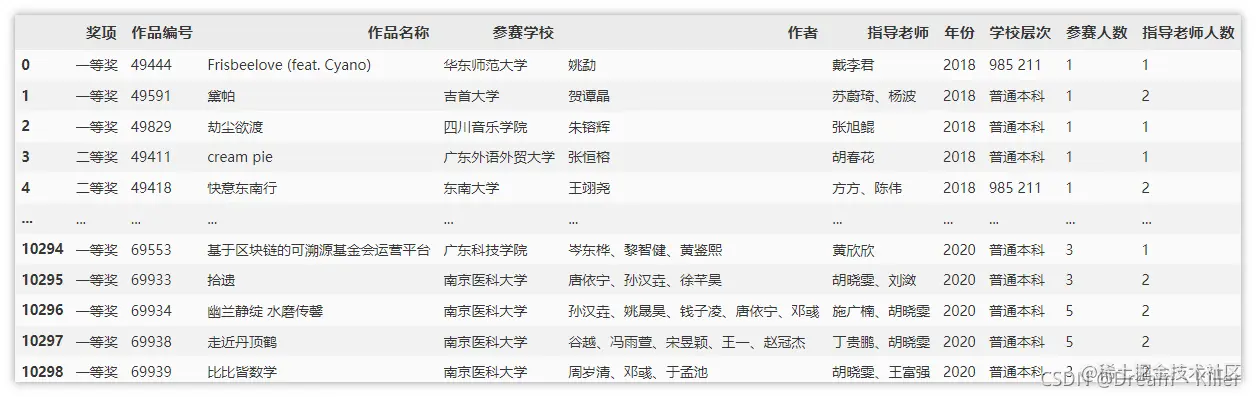 现在我们要对合并后的数据集进行一些处理,以便更好地分析及可视化。由于之后我们要用到全国高校的一些基本信息,如学校层次(985 211等),所以需要导入 college_info.csv ,该数据是博主在 6月15日 爬取的,部分高职高专可能并未收录,对于这部分高校就将对应标签赋值为 “暂无数据” 。清除参赛学校和作品名称中的换行符“\n”,之后添加 参赛人数列 来记录 各作品作者人数 ,指导老师人数列 记录 该作品指导老师人数。