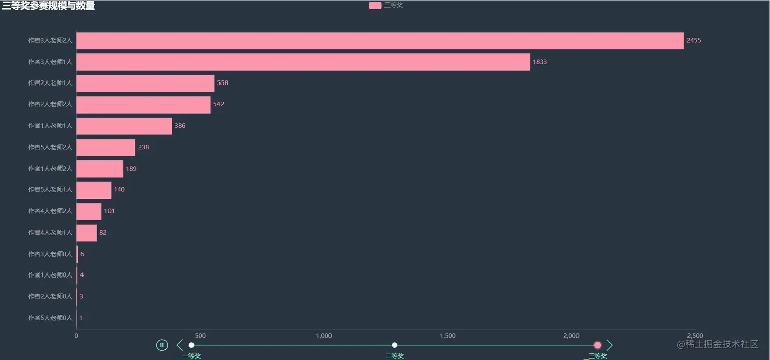 从上图中观察发现,随着时间的推移,一等奖、二等奖的比例开始减少,三等奖比例增加,在 2020 年三等奖比例达到68%,不难看出赛方想要增加一等奖的含金量。