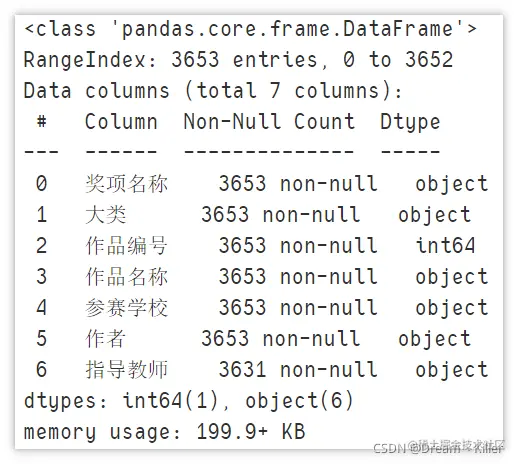 观察 2020 年的数据,相比于前两年的数据,它的各列都没有缺失值,但2020年的获奖信息中并没有包含作品类别这一列,所以我们处理数据集时要将前两年的类别列进行删除。这样,我们可以按照 2020 数据集的格式作为模板,将前两年的数据集转换为相同的格式,再进行合并。
