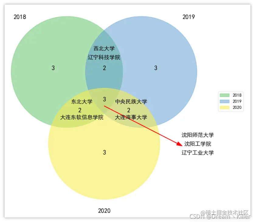 下面使用韦恩图详细看一下,哪些学校多次进入得奖最多 Top10。