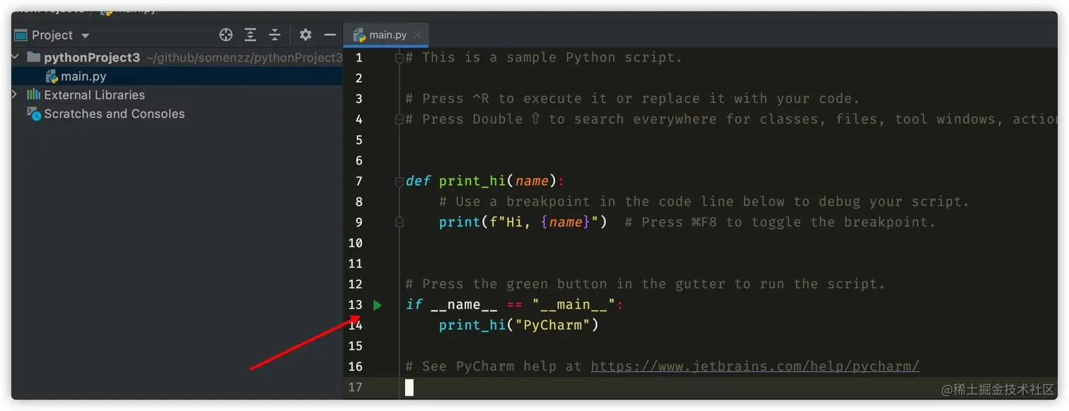 其实,这也是 PyCharm 推荐的作法,当你新建一个项目的时候,它默认创建的 main.py 就是长这样的: