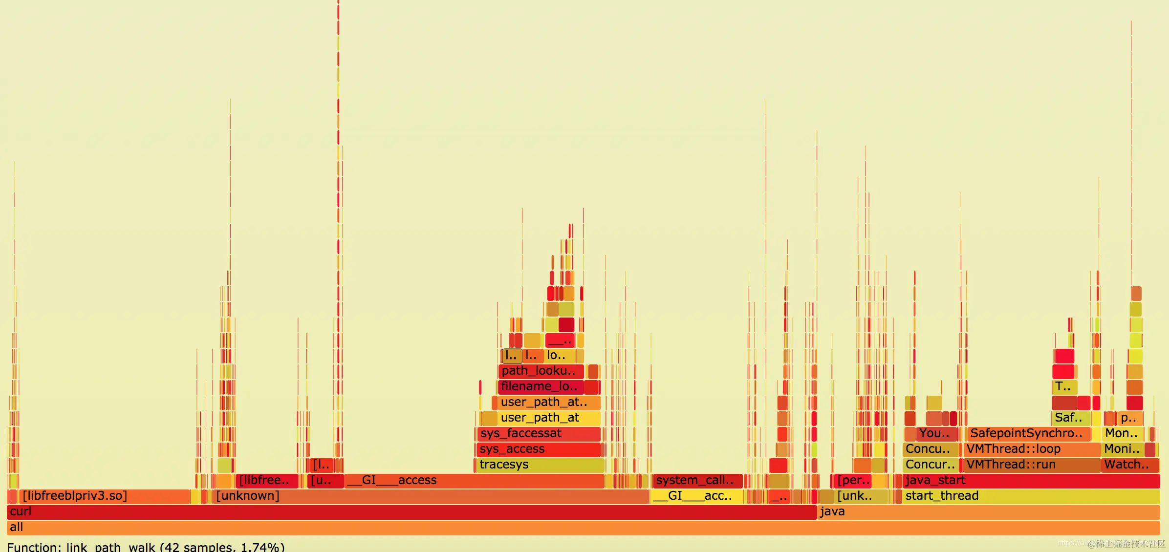 在JAVA开发过程中,通过visualvm的cpu抽样和内存抽样就可以达到上述效果,CPU抽样的堆栈就可以看出线程的调用关系,最后一层往往都是JDK的api调用,在这个过程中,基本就能定位到自己的哪个方法比较耗时了,但是如果光通过JDK的api还看不出问题,那就需要通过火焰图来看系统调用了,做更深次的性能分析。