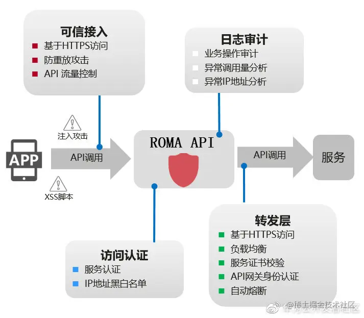 API的开放面临着DDOS、XSS、钓鱼、暴力攻击等的安全攻击风险,ROMA API提供了一套完善的4层防护架构。