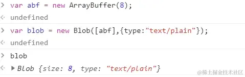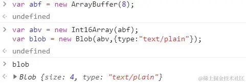 第三种:创建一个装填ArrayBufferView对象的Blob对象(ArrayBufferView可基于ArrayBuffer创建,返回值是一个类数组。如下,创建一个8字节的ArrayBuffer,在其上创建一个每个数组元素为2字节的“视图”)