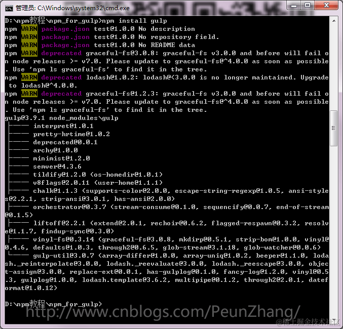 输入命令npm install gulp -ES, 留意package.json 文件的 dependencies 字段,以看出版本号中的 ^ 消失了