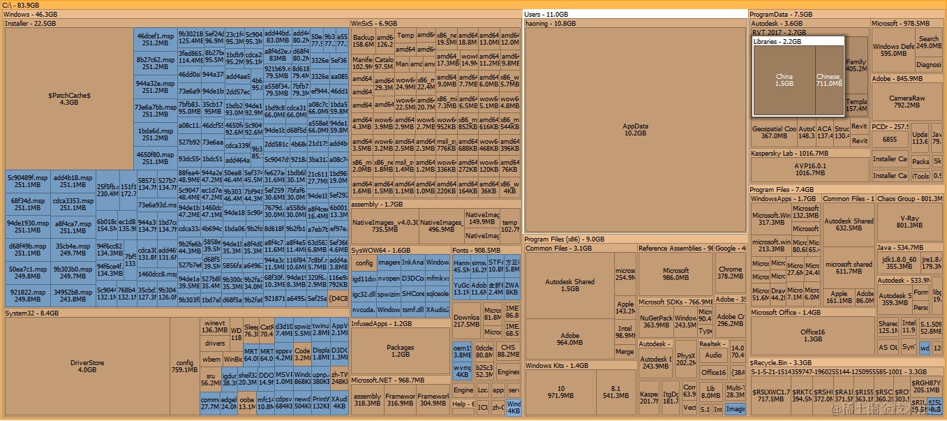 使用 Dism++ 清理后,你的 Windows 系统应该说是比较干净的了。但是,C盘又不是全是 Windows系统占用空间,除了 C:\Windows 以外,还有 Program Files (x86) 、Program Files 和 AppData 这几个大头。