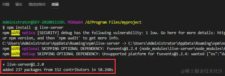 3、接下来还要用npm安装一个包来开启本地服务器,使用ctrl+`快捷键打开终端,然后输入npm install -g live-server,出现红框标注的那个部分就说明安装成功了