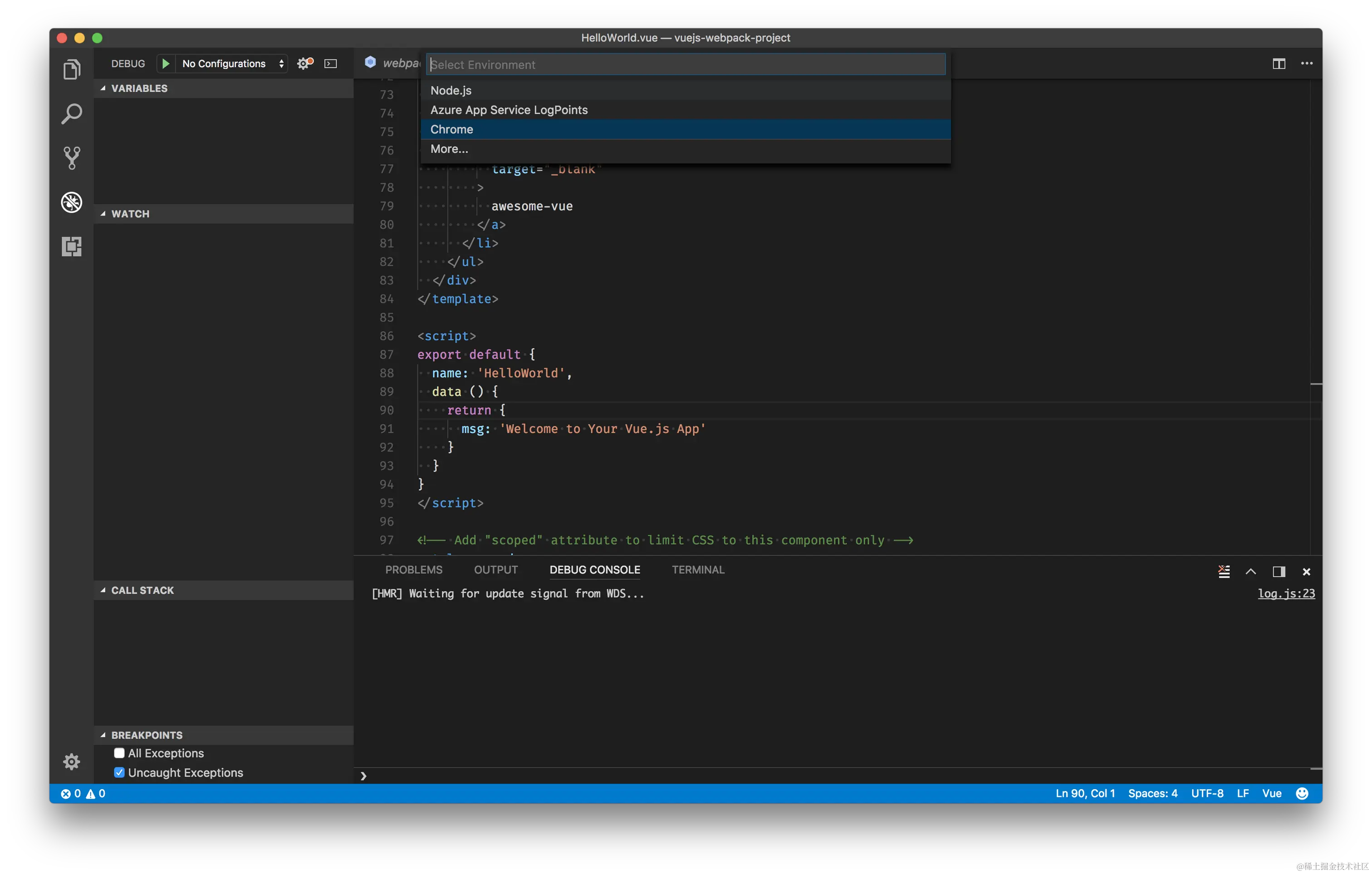 来到 Debug 视图,选择 “vuejs:chrome/firefox” 配置,然后按 F5 或点击那个绿色的 play 按钮。