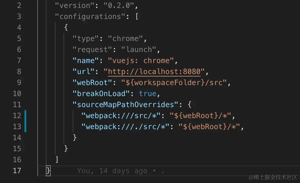 vscode 默认生成的 launch.json 是没有第 13行的。通过修改配置让vscode 知道 webpack 调试的文件对应项目的本地文件。问题解决。
