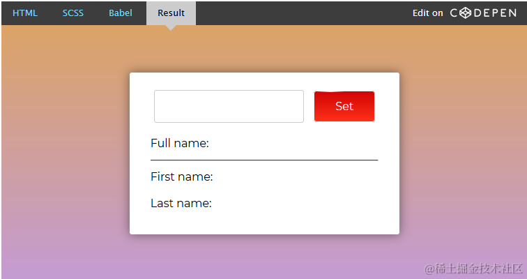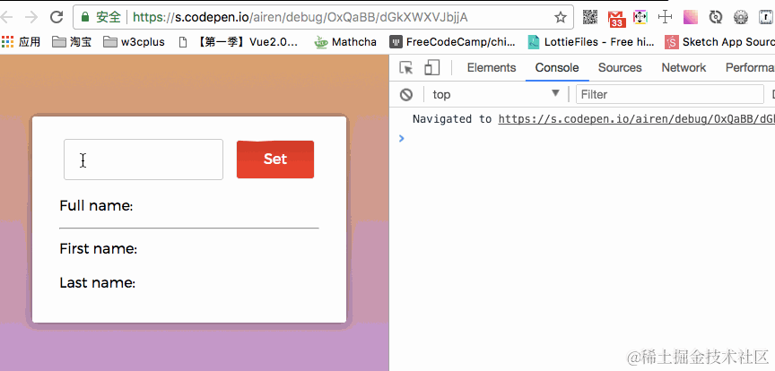 你在输入框中输入一个fullName,然后点击set按钮,可以看到对应的效果。你现在再运行app.fullName="Airen liao"时,计算属性的setter会被调用,app.firstName和app.lastName也相应地会被更新。如下图所示: