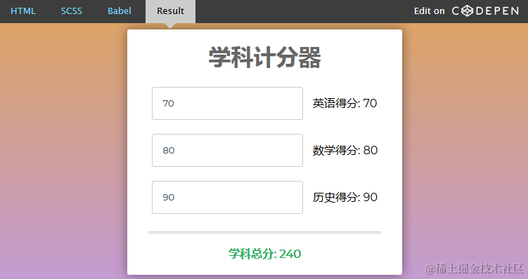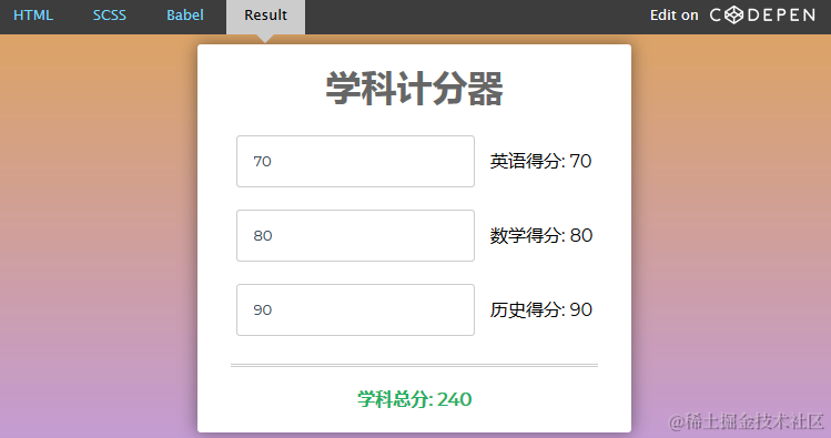 我们可以使用Vue中的method计算出学科的总分,最终得到的总数结果是相同的。