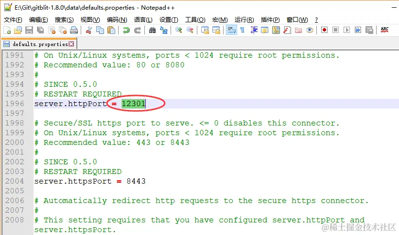 4) 找到 server.httpPort,设定http协议的端口号(注意:所使用的端口不要与已有端口冲突)。