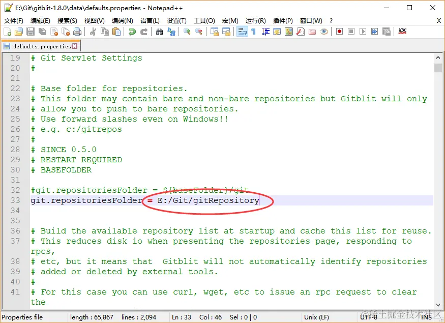 2) 找到Git目录下的data文件下的 gitblit.properties 文件,用“记事本”或文本编辑器打开。