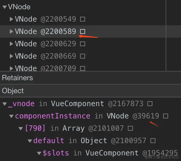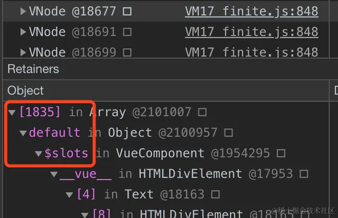 然后,想想为什么所有虚拟DOM都留在了内存中呢,展开一个来看对象的引用关系,有一个$slot.default