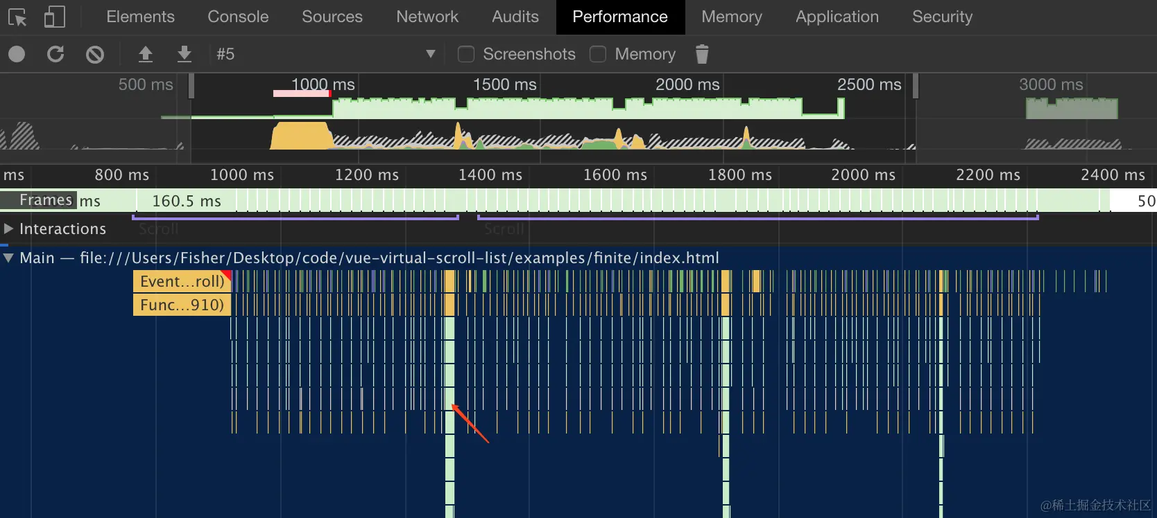 分析过程,我比较喜欢用Performance面板,这里有非常详细的函数调用栈,