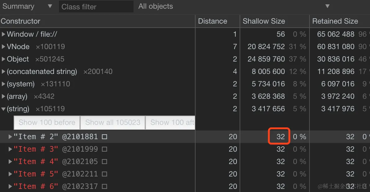 这个长列表总共10w条数据,仅仅渲染了50条(6 + 44)数据,每条数据仅仅是短短的字符串,不该占用这么多内存