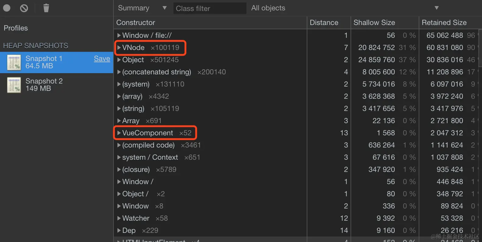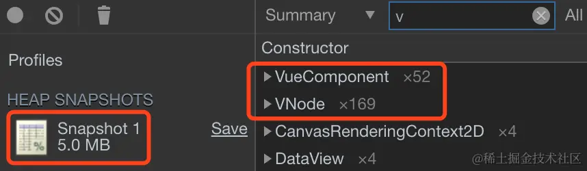 可以发现VNode增长了一部分,而最为瞩目的是VueComponent数量竟然有那么多,按道理应该只有渲染的几个组件的