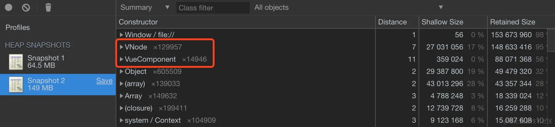 上图中左侧是两个快照的结果,64.5M是进入页面之后的内存快照,149M是各种操作之后的内存快照
