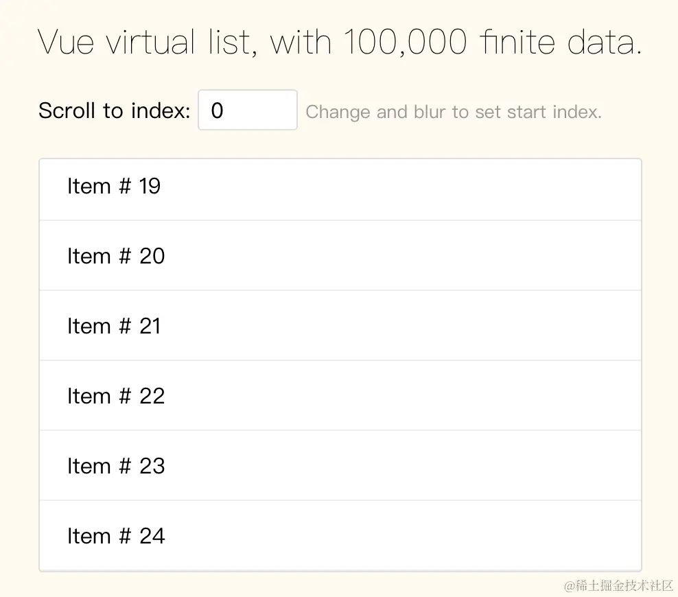 <VirtualList :size="50" :remain="6" :bench="44" class="list" :start="startIndex" :debounce="10">