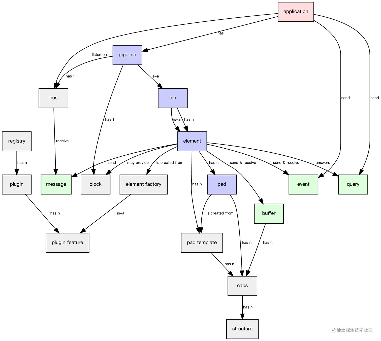 事件Events通常在下游的元素Elements之间或者上下游的应用程序Application和元素Elements之间发送的。下游downstream的元素之间的事件Events可以用来做同步Synchronize使用