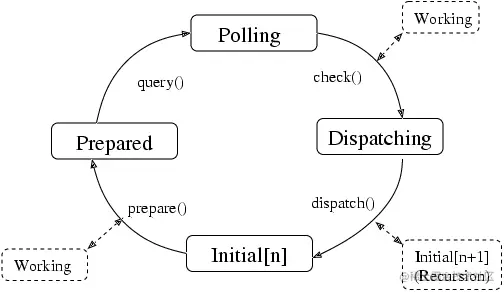 执行g_main_context_iteration() 函数可以完成GMainContext的单次迭代。在一些情况下,我们可能想获取主循环更多的底层控制细节,我们可以调用g_main_context_iteration() 里的组件函数:g_main_context_prepare () 、g_main_context_query() 、g_main_context_check() 和g_main_context_dispatch() 。