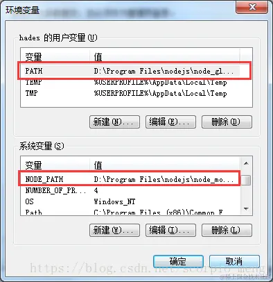 系统变量设置:添加变量 NODE_PATH 值为:D:\Program Files\nodejs\node_modules