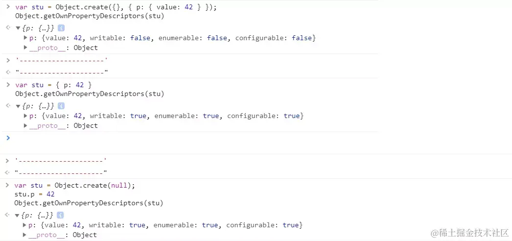 Object.create() 用第二个参数来创建非空对象的属性描述符默认是为false的,而构造函数或字面量方法创建的对象属性的描述符默认为true。看下图解析: