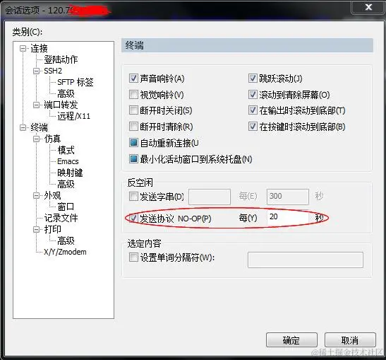 有 时候服务器端的 /etc/profile 或者 ~/.bash_profile 中设置了 TMOUT 选项,或者是 /etc/ssh/sshd_config 文件中设置了客户端连接时间的设置,很可能一段之间之后,SecureCRT就会被断开连接,所以SecureCRT又一个选项可以设置每隔多少秒自动发 送一个信息到服务器端,告诉服务器端客户端还在连接中。